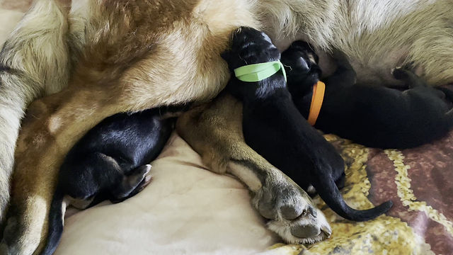 The pups are collared with green, orange, and yellow whelping collars so we can tell them apart. The yellow collared pup is the female. At the moment, she is "lunching" under Gussie's leg. The boys are "dining" more toward Gussie's front, so they both are more visible.